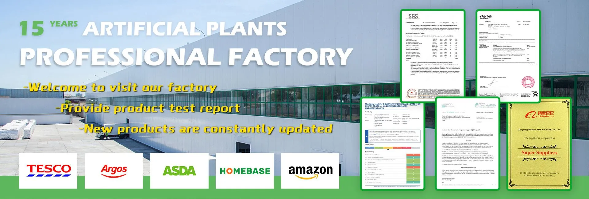 Zhejiang Ruopei Arts & Crafts co, Ltd te fonde an 2013. Li se yon nouvo materyèl dekorasyon rechèch ak devlopman antrepriz entegre devlopman pwodwi, konsepsyon, pwodiksyon, depo, lavant ak lòt endistri ak komès; Pwodwi prensipal yo se panèl bòdi atifisyèl bwi, pye bwa atifisyèl, boul zèb atifisyèl, ak plant bonsai atifisyèl, ekran kloti Ivy atifisyèl, kouwòn atifisyèl, panyen flè atifisyèl pandye ak lòt fonksyon nouvo ak nouvo seri dekorasyon materyèl.